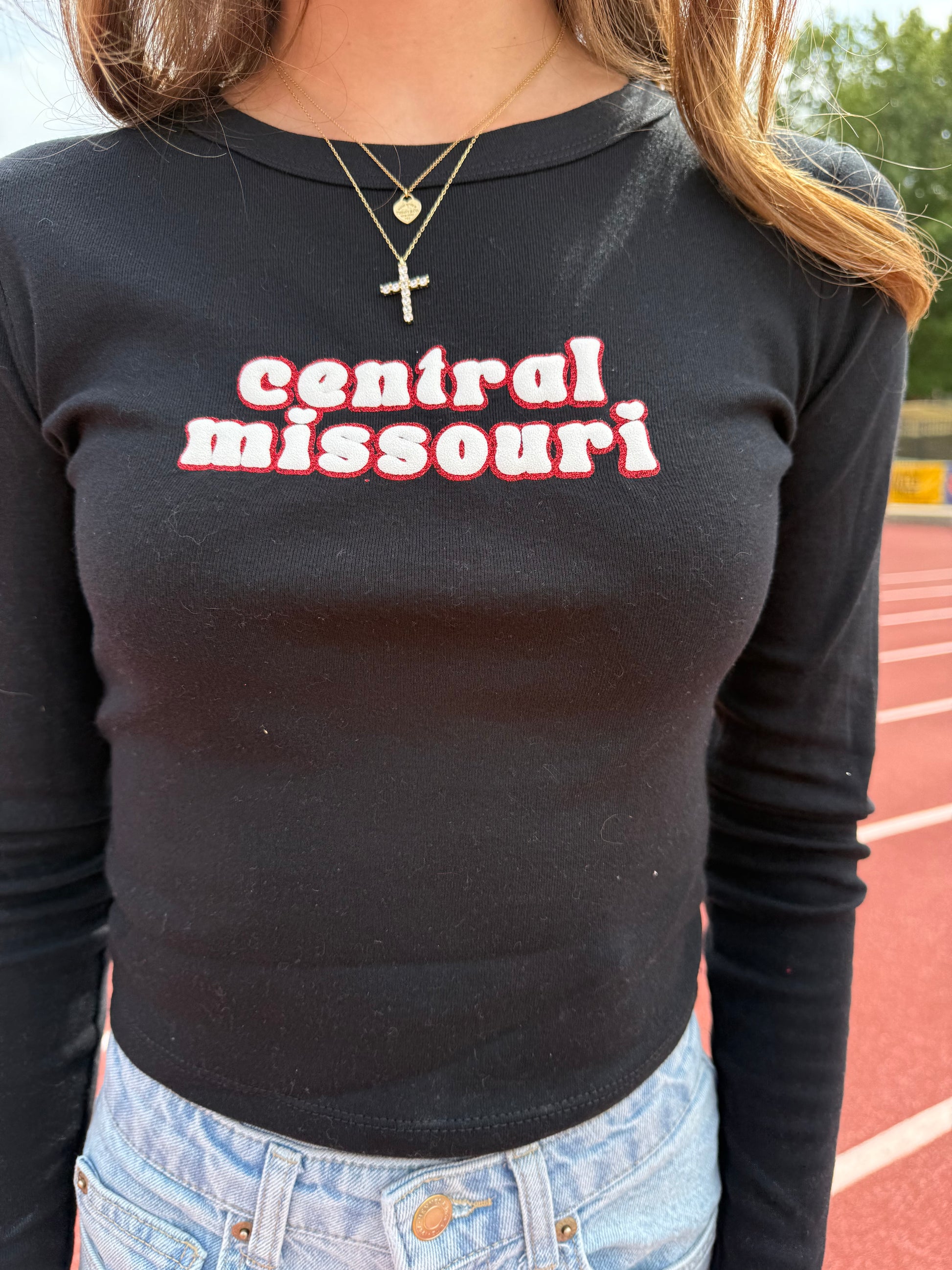 Black womens fit long sleeve baby tee with Central Missouri with red sparkles outline and white lettering.