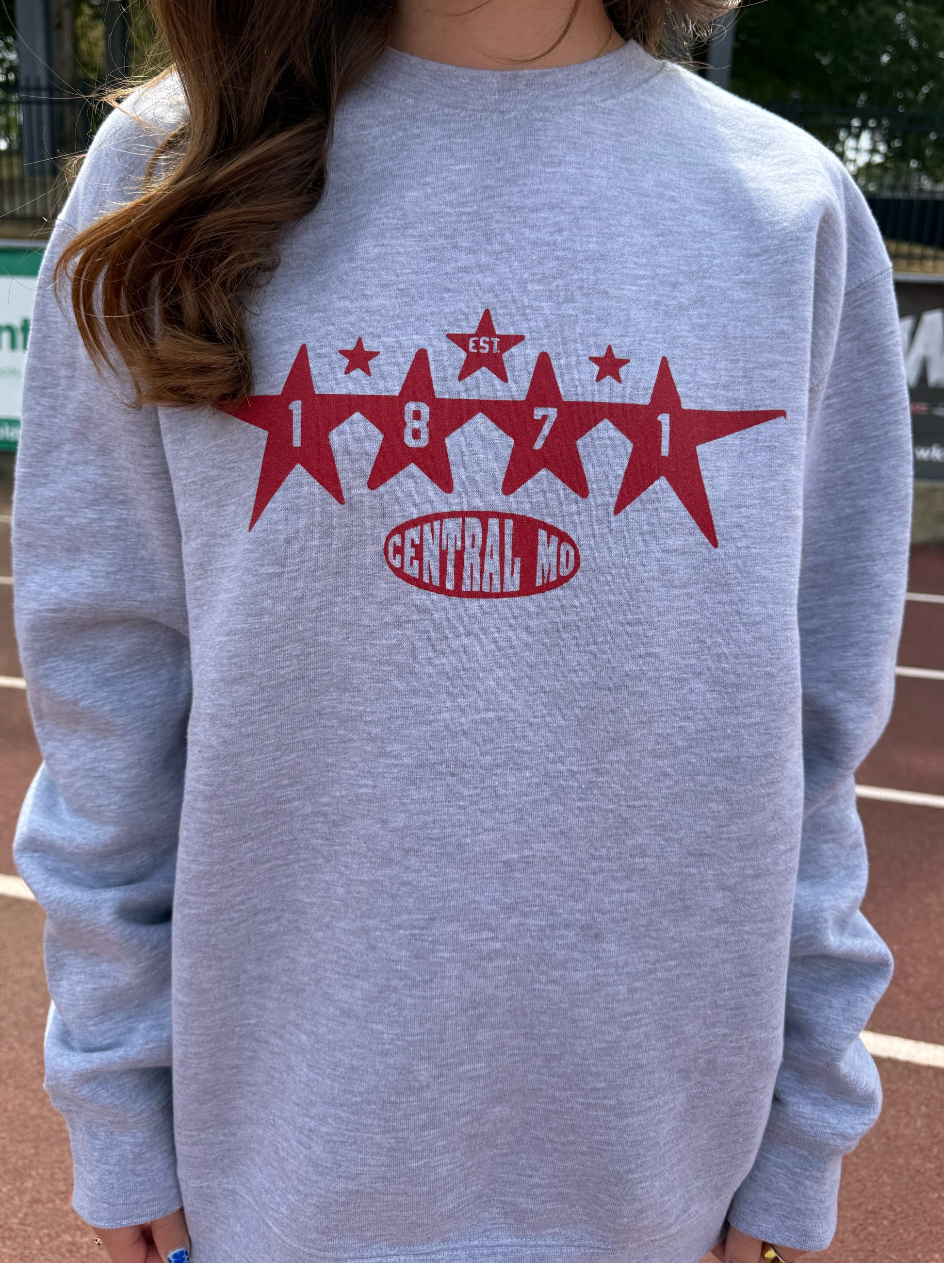 Grey unisex fit heavy blend fleece crewneck with retro style Est. 1871 and Central MO with stars in red.