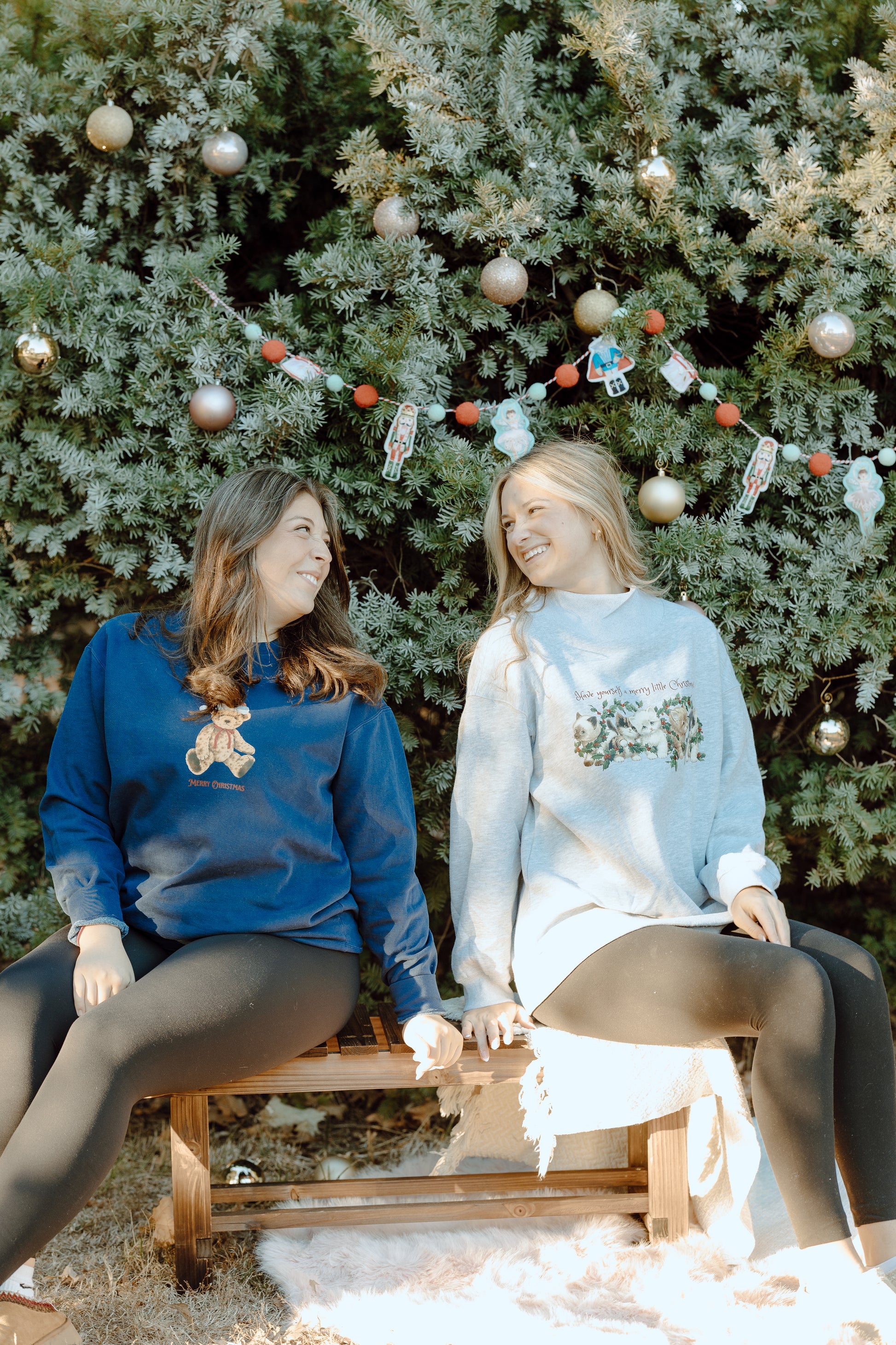 Forest green women's comfort colors Taylor Swift inspired crewneck with lyrics "My heart is a Christmas tree farm" in stitching font and three Christmas trees at the bottom.