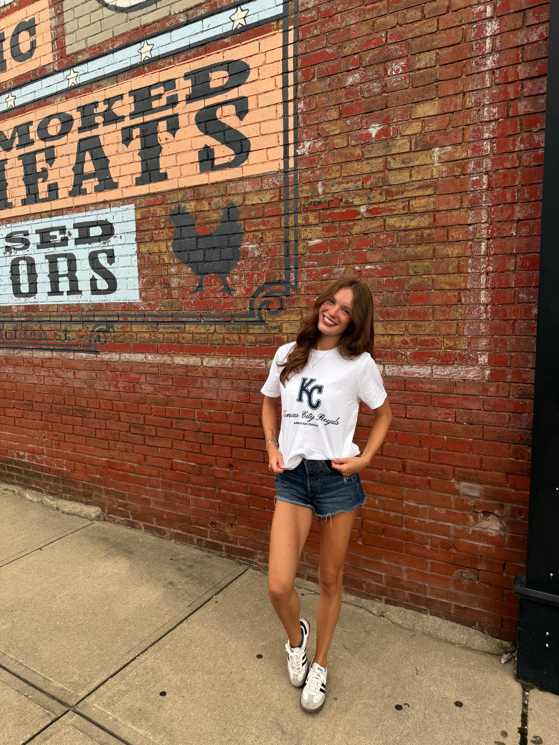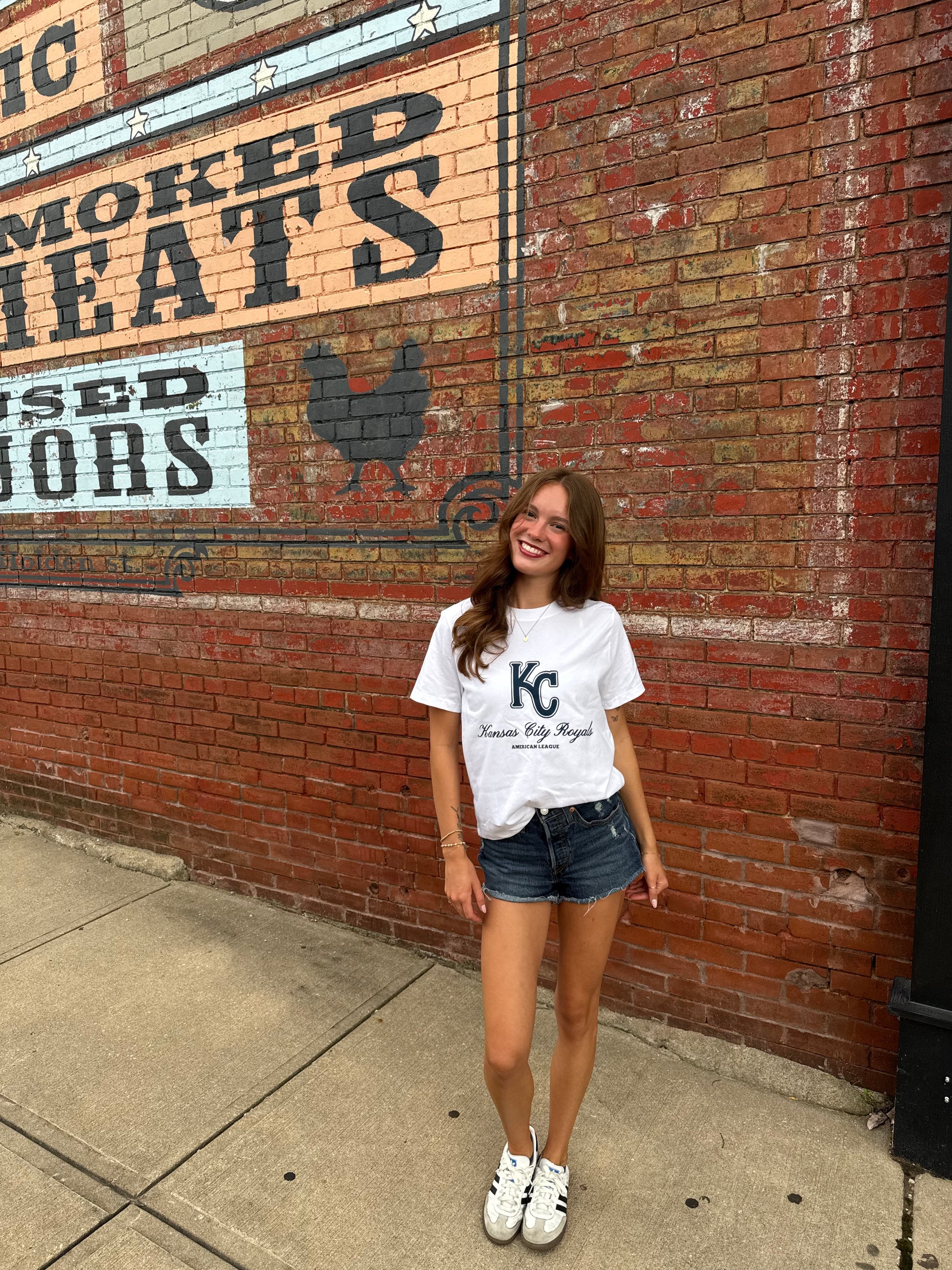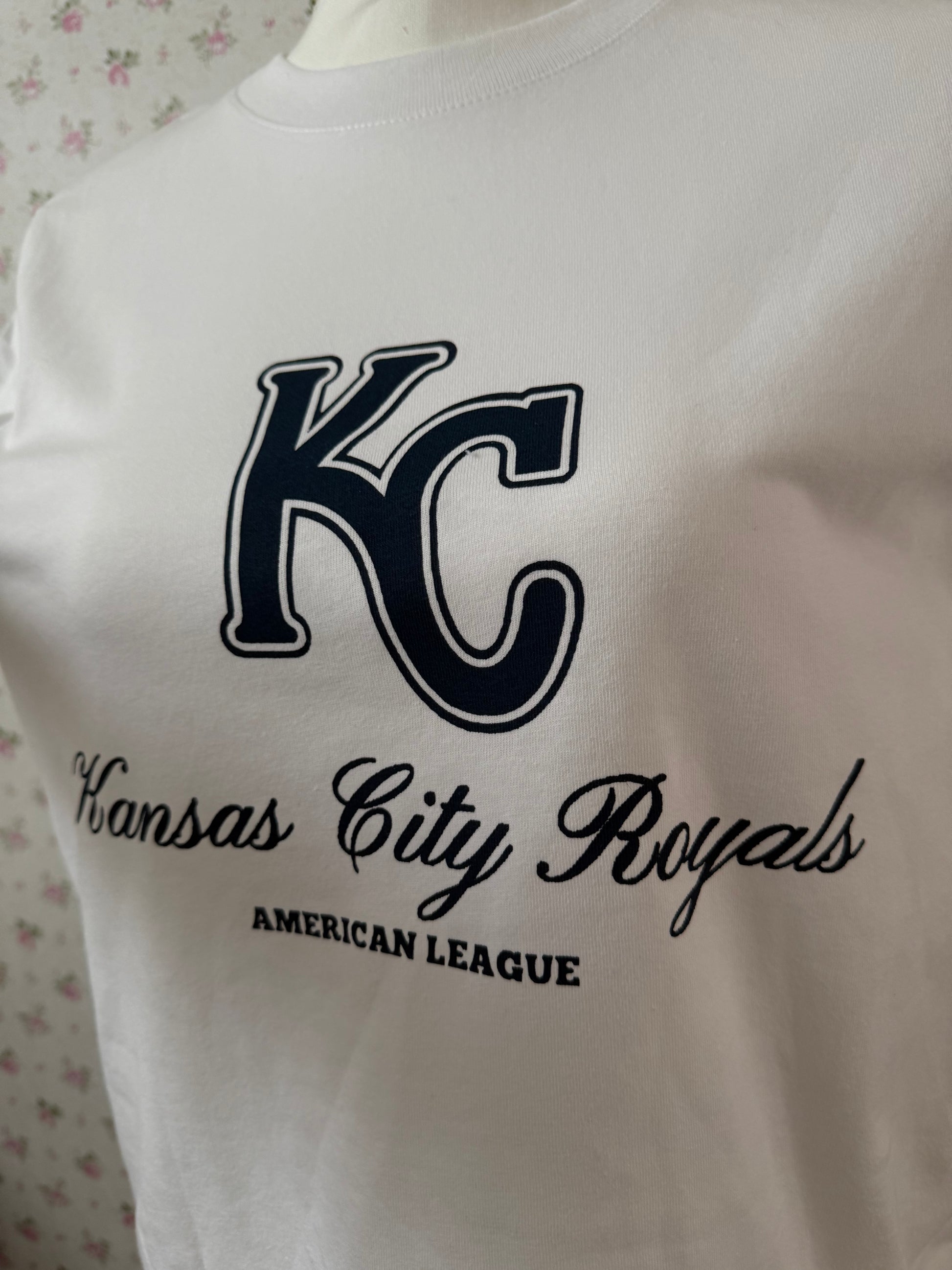 White women's fit cropped boxy t-shirt with navy lettering on front that reads "KC Kansas City Royals American League" on the front.