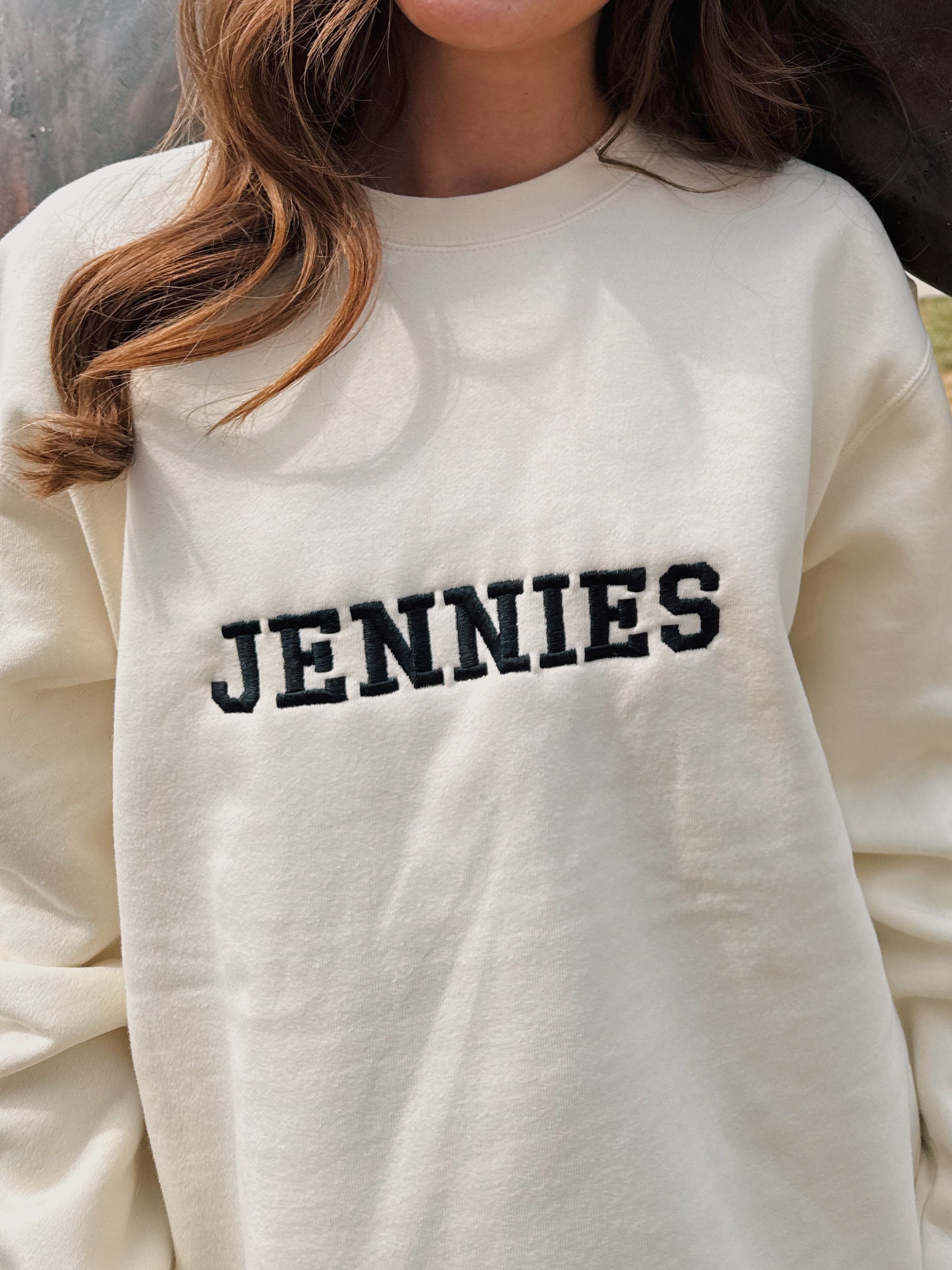 Cream unisex fit heavy blend crewneck with MULES or JENNIES embroidery in black letters.