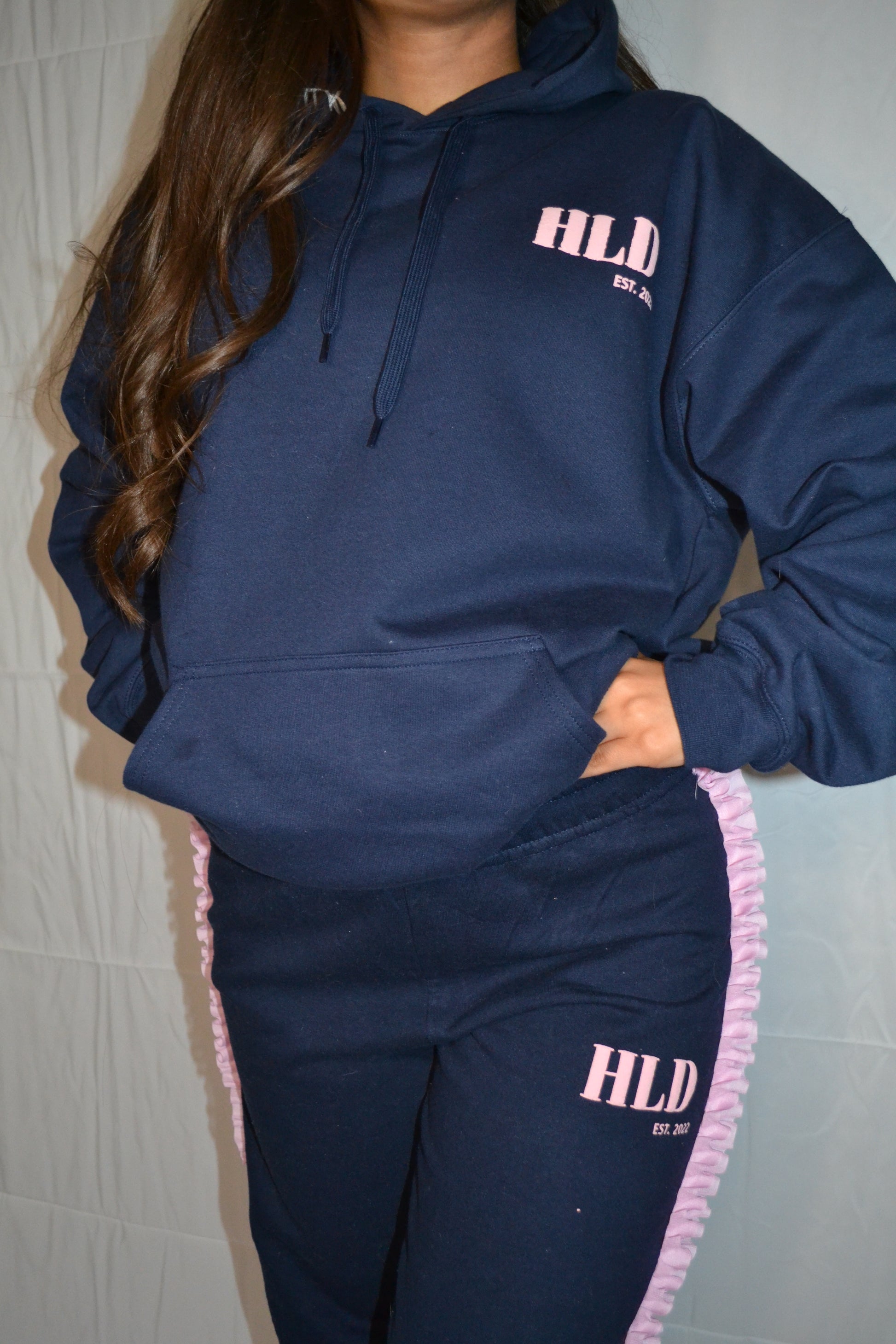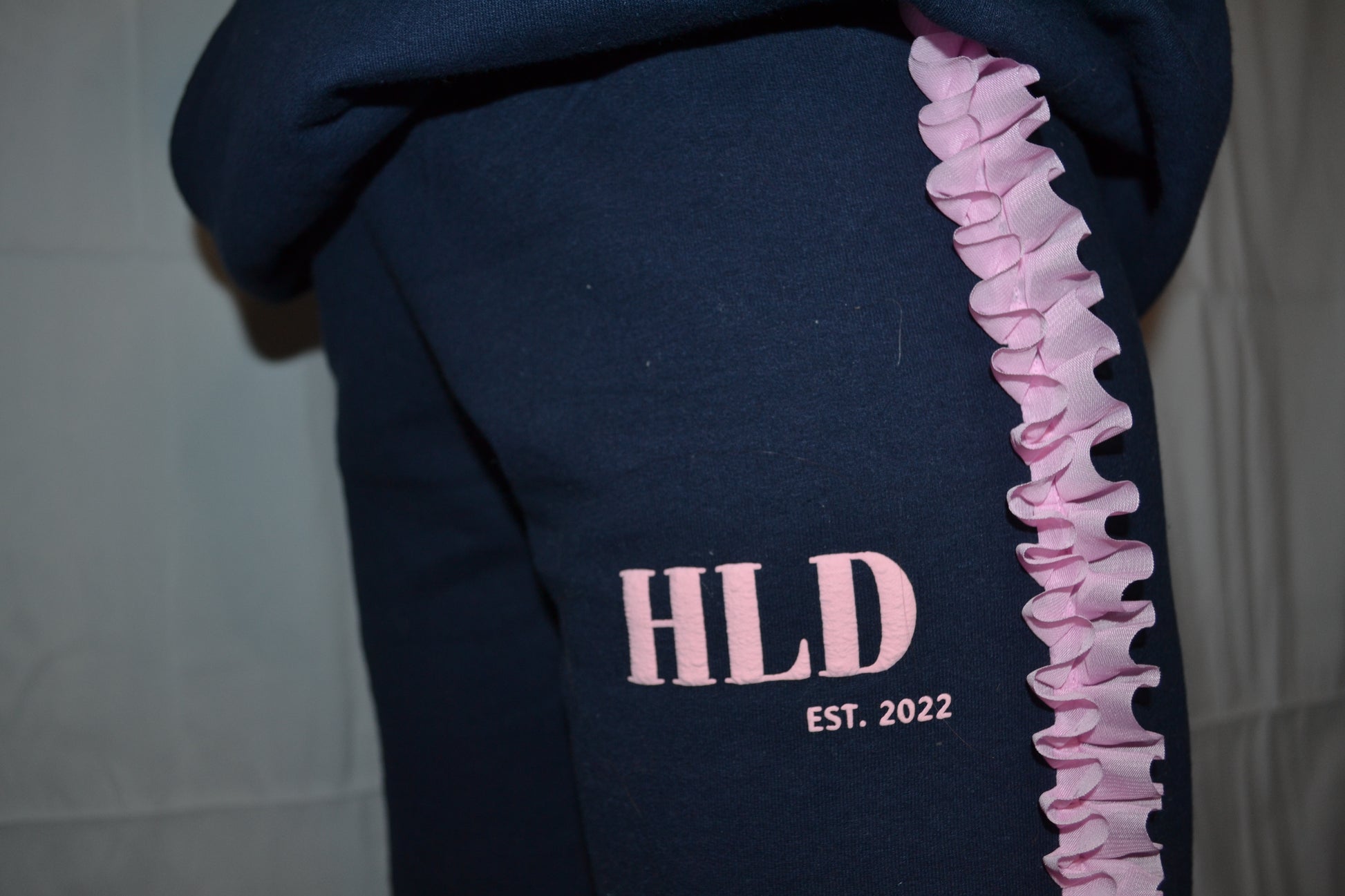 This Navy and pink sweatpants have pink ruffles on both sides and a matching HLD logo on the sweatpants. The ruffles are hand sewn double stitched on both sides.