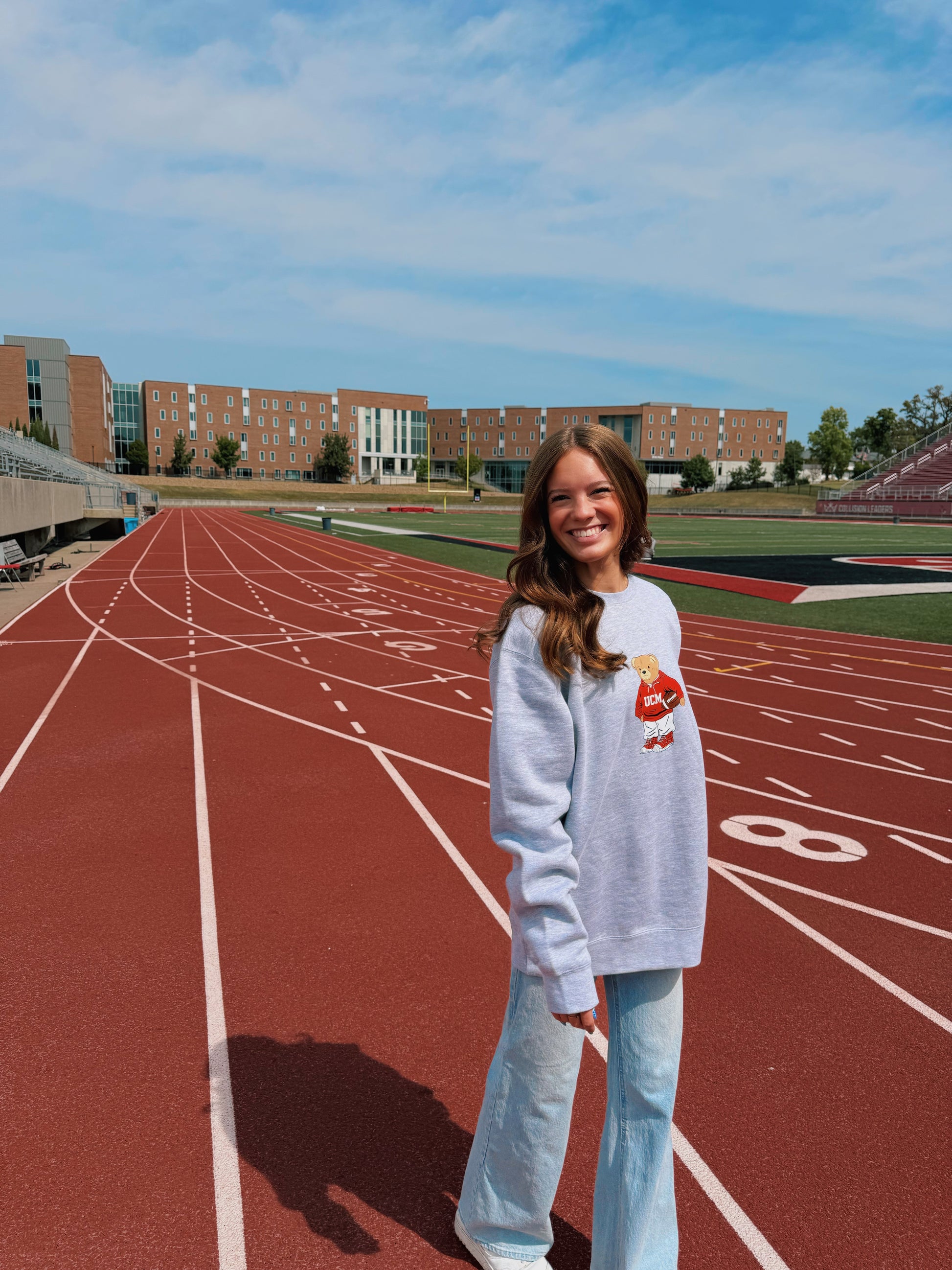 Grey unisex fit heavy blend fleece crewneck with a hand drawn bear holding a football wearing a UCM sweatshirt.